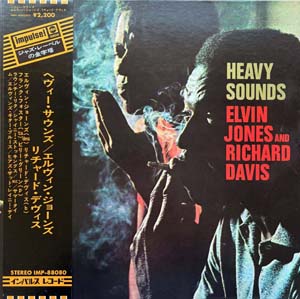 1421. JONES, ELVIN & RICHARD DAVIS: “Heavy Sounds” (Impulse – IMP-88080) (Record: Near Mint/ Gatefold Jacket: Excellent ~ Near Mint – some faintest foxing spots inside gatefold/ Insert: Near Mint/ Obi: Near Mint). Japan 1973 original press issue all complete with insert and OBI. Heavy Sounds, indeed – a beautiful little set of dark-edged soul jazz from the mid 60s – co-led by bassist Richard Davis and drummer Elvin Jones! The sound here is a bit different than any work ever released by either player as a leader – and is almost more in the vein of Blue Note or Prestige work of the same period – hardbop turned towards more soulful notes, but also still touched with a degree of modernism. A key element in the group is Frank Foster on tenor – whose blowing here is superb, and really on a par with his own albums as a leader from the time – marking a strong sound away from too many years of Basie influences! Frank does a killer job on his own "Raunchy Rita", taken here in a nice sexy groove, and stretched out nice and long with a very sinister feel – and other tracks include "ME", "Summertime", and "Elvin's Guitar Blues", which actually features Jones on guitar! Price: 75 Euro |