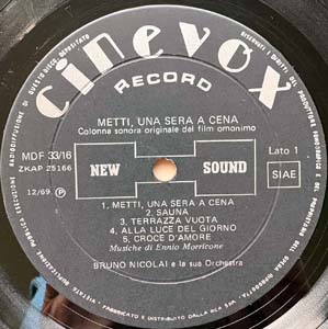 1977. OST - GASLINI, GIORGIO: “Le Sorelle” (Cinevox Record – MDF-33/22) (Record: Near Mint/ Jacket: Near Mint). Top shape Italian 1969 first original press issue of damned scarce Gaslini slide. Le Sorelle is a passionate Giorgio Gaslini score written for Roberto Malenotti’s movie, a lesbian soft-core film starring Nathalie Delon and Susan Strasberg. Martha (Strasberg) and Diana (Delon) are two sisters who had a passionate affair in the past which lead to their break-up. Giorgio Gaslini’s score is an excellent example of character themes with each major character receiving a memorable accompaniment. From Martha’s passionate motive to Diana’s decadent Baroque theme and Alex’s (the male main character) impotence transferred to music, this lyrical score has a hint of Gaslini’s memorable jazz compositions with some experimental psychological disturbance complimenting the larger-than-life forbidden romance. The haunting main title piece “Voce di uno strato psicológico” contains a rare solo performance by Edda dell’Orso. Top shape and a hauntingly beautiful jazz score that keeps on resonating in my ears. Price: 400 Euro |