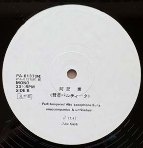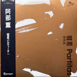 3. ABE KAORU: “Suisei Partitas” (Nadja – PA-6137~38) (Records: Near Mint/ Gatefold Jacket: Near Mint/ OBI: Near Mint). 1st original pressing complete with OBI!!!! 2 LP Set. Hardly ever seen or offered rare WHITE label PROMO issue that comes with rare PROMO ONLY two-sided INSERT as well that promotes a new Kaoru Abe album Overhang Party and on the back other ALM Record releases!!!! Great original copy and first press of Japan’s all time hard blowing saxophone wonder Abe Kaoru. This is the 1st pressing. (Second press came out on the Kenwood imprint.) Amazing free jazz saxophone improvisational workouts. Legendary and utterly historic recording. Subtitled “Well-Tempered Alto-Saxophone Suite “Partitas – Unfinished” For Joyness Of All Beginners And Also Exparts”. Among the plethora of solo performances that have come to light since Abe's untimely passing in 1978 at the age of 29, this might well be his definitive statement. Originally issued in a miniscule run in 1981, “Partitas” captures Abe at the height of his powers in March 1973. The four lengthy pieces that comprise this set make for a most challenging listening experience that puts on display a soul of immeasurable depth filled with distress and solitary angst. His hard blowing guts gushes out furious dancing note clusters that balance on your earlobe before caving in on your skull. Generally speaking, Abe’s performance on this disc does resembles a high tensioned sound, like a killer babe dressed only in high-heeled stiletto boots trampling on your private parts. A real killer, portraying Abe in a fascinating period of transition, delivering a highly salient and audaciously experimental recording that blows all the nowadays would be improvisation impersonators straight out of the water with their tail whopping between their legs. Rare to say the least. Extremely beautiful copy hardly turns up in such a perfect state. Historical and much in demand these days. Never offered before MINT PROMO WHITE label issue all complete with PROMO ONLY insert. Price: 450 Euro |