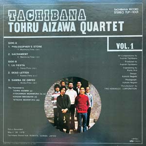 21. AIZAWA TOHRU QUARTET: “Tachibana” (Tachibana Record – TLP-1001) (Record: Near Mint ~ Mint/ Gatefold Jacket: Near Mint ~ Mint). Freakingly rare 1975 Japanese spiritual jazz private pressing that came out in a ludicrous small pressing of around 200 copies only. Best condition imaginable original. The album, Tachibana, was recorded in 1975 and this privately pressed record was the only album made by the Quartet, four amateur musicians who were university students at the time. The session was financed by a local businessman, Ikujiro Tachibana, who pressed up a few hundred copies to use as a business card. In the intervening 40 odd years since its recording, few copies have surfaced, making it an in-demand yet elusive artifact from the golden age of Japanese jazz. Tachibana has all the necessary components of a cult album: pressed in small numbers, a few mysterious and vague details about its origins, languishing in obscurity for decades and, above all, superb musical craftsmanship and skill. The album opens with the dynamic percussion work-out Philosopher’s Stone written by the then law-student and drummer Tetsuya Morimura. It propels along with the band at full pelt, showcasing Morimura’s well-developed drumming style. For a teenage amateur player to compose and perform such an accomplished and impressive piece is a testament to the talent that the band contained. Philosopher’s Stone is followed by Sacrament, an epic modal composition by saxophonist Kyoichiro Morimura that fans of Wayne Shorter, Pharoah Sanders and late-era John Coltrane will appreciate. After an extended intro the band drop into a heavy, churning groove, Morimura’s saxophone scorching above the volcanic rhythm section. Dead Letter, written by Aizawa himself, is an epic piano led symphony of spiritual jazz. Think McCoy Tyner at his imperial finest and you’ll get a flavour: impact, emotion and power all suffuse to create an overwhelming experience. Amazingly, this is still the only Aizawa composition yet to be recorded. The Tachibana album also includes two cover versions, both Latin flavoured numbers delivered with élan and brio: La Fiesta by Chick Corea and the classic Samba de Orfeu by Luiz Bonfá. So, just five tracks in total, the sole existing evidence of an astonishing band, the Tohru Aizawa Quartet. Amazing condition original first press issue – best and cleanest one I have ever seen or had so…final upgrade condition copy. Price: Offers!!! |