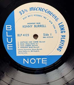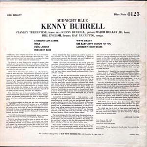 351. BURRELL, KENNY: “Midnight Blue” (Blue Note – BLP-4123) (Record: Excellent with only an occasional sleeve line/ Jacket: Excellent – clean cover, faint trace of humidity stain on back cover right hand side but minimal/ Company Inner Sleeve: Near Mint). Extremely nice condition 1963 US very first MONO press original. Side 1 DEEP GROOVE issue with New York labels and Plastylite “Ear” mark in the dead wax and VAN GELDER machine stamped. Comes housed in front laminated cover. Considered one of the most renowned albums from Blue Note's classic era, this record is often identified as a quintessential example of Kenny Burrell's work as a guitarist. Burrell, who had an established career and prior recordings with Blue Note, demonstrates a distinct approach on this album, characterized by a stronger groove and a more pronounced edge in his guitar playing. The supporting ensemble includes Stanley Turrentine on tenor saxophone, Major Holly on bass, Bill English on drums, and Ray Barretto contributing on congas. The album features a dynamic interplay among the musicians, with Turrentine's tenor saxophone providing a notably raspy tone. Ray Barretto's percussion adds depth to the rhythm section, resulting in a cohesive and rhythmically engaging performance throughout the album. Nice EX+ condition original 1st MONO pressing. Price: Offers!!!!! |