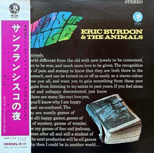324. BURDON, ERIC & The ANIMALS: “The Twain Shall Meet” (MGM Records – SMM-1161) (Record: Near Mint/ Jacket: Near Mint/ Insert: Near Mint/ Obi: Near Mint). Japan first press issue all complete with obi that came out in 1968 and that comes housed in Japan only cool sleeve art. This later work from The Animals represents a noteworthy evolution in the band's sound, displaying a more restrained approach compared to some of their earlier, more experimental recordings from the late 1960s. Eric Burdon's growing interest in soul and funk styles begins to emerge, while the music retains its rock foundation. The pronounced bass adds depth and complements the somber tone of Burdon's lyrical delivery. Produced by Tom Wilson, the recording features a distinctive, slightly raspy lo-fi aesthetic that departs from the group's blues roots, anticipating elements commonly found in indie music of subsequent decades. Price: 125 Euro |